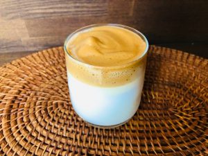 ②グラスに牛乳を入れ、泡立った①を上に乗せて完成です。